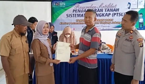 Tanjung Jabung Timur, Jambi, transnewss.com – Warga Desa Pandan Lagan, Kecamatan Geragai, Kabupaten Tanjung Jabung Timur, kini bisa bernapas lega. Sebanyak 179 bidang tanah yang mereka ajukan melalui program Pendaftaran Tanah Sistematis Lengkap (PTSL) telah memiliki sertifikat resmi. Penyerahan sertifikat ini dilakukan oleh Kepala Desa Elfiana Ijriati bersama jajarannya dan perwakilan Badan Pertanahan Nasional (BPN) Kabupaten Tanjung Jabung Timur pada Selasa, 26 Agustus 2025.