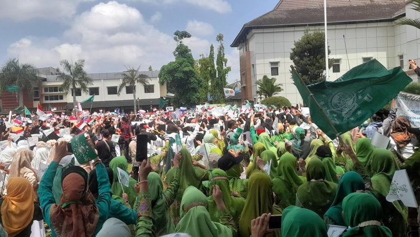 Mengenakan pakaian dengan mayoritas warna putih dan hijau, mereka menyesaki area dalam area Polda DIY. Massa juga menjajarkan diri di sebagian jalan Ring Road Utara depan Mapolda DIY yang aksesnya oleh polisi.