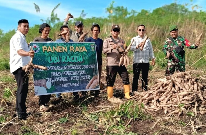 OKU, transnewss.com – Suasana semarak dan penuh optimisme menyelimuti lahan pertanian Desa Mekarsari, Kecamatan Sosoh Buay Rayap, Kabupaten OKU, pada Rabu, 08 Oktober 2025. Sinergi antarinstansi terekam jelas dalam kegiatan panen raya ubi racun seluas dua hektar yang difasilitasi langsung oleh Kepolisian Sektor (Polsek) setempat.