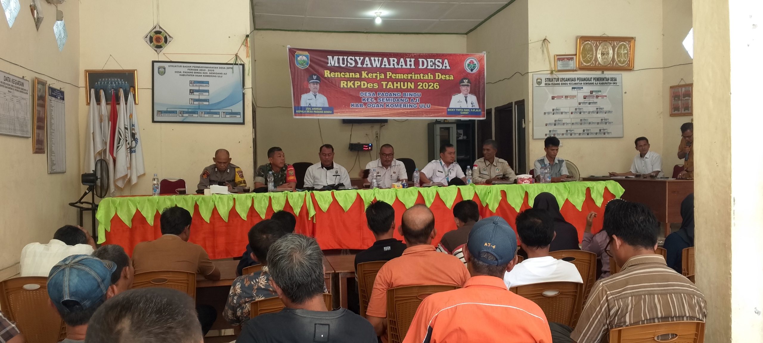 Padang Bindu, OKU, transnewss.com  – Pemerintah Desa Padang Bindu berhasil menyelenggarakan Musyawarah Desa (Musdes) untuk penyusunan Rencana Kerja Pemerintah Desa (RKPDes) dan Daftar Usulan Rencana Kerja Pemerintah Desa (DU-RKPDes) Tahun Anggaran 2026. Acara penting ini berlangsung pada Rabu, 9 Juli 2025, di Aula Kantor Desa Padang Bindu.