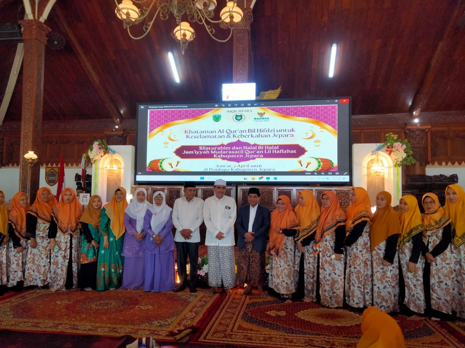 JEPARA, transnewss.com – Jam’iyyah Mudarasatil Qur’an Lil Hafizhat (JMQH) Kabupaten Jepara sukses menyelenggarakan kegiatan Khataman Al-Qur’an Bil Hifdzi. Acara yang juga dimaknai sebagai momen silaturahim dan Halal Bi Halal 1447 H / 2026 M ini berlangsung khidmat di Pendopo Kabupaten Jepara, Jumat (3/4/2026).