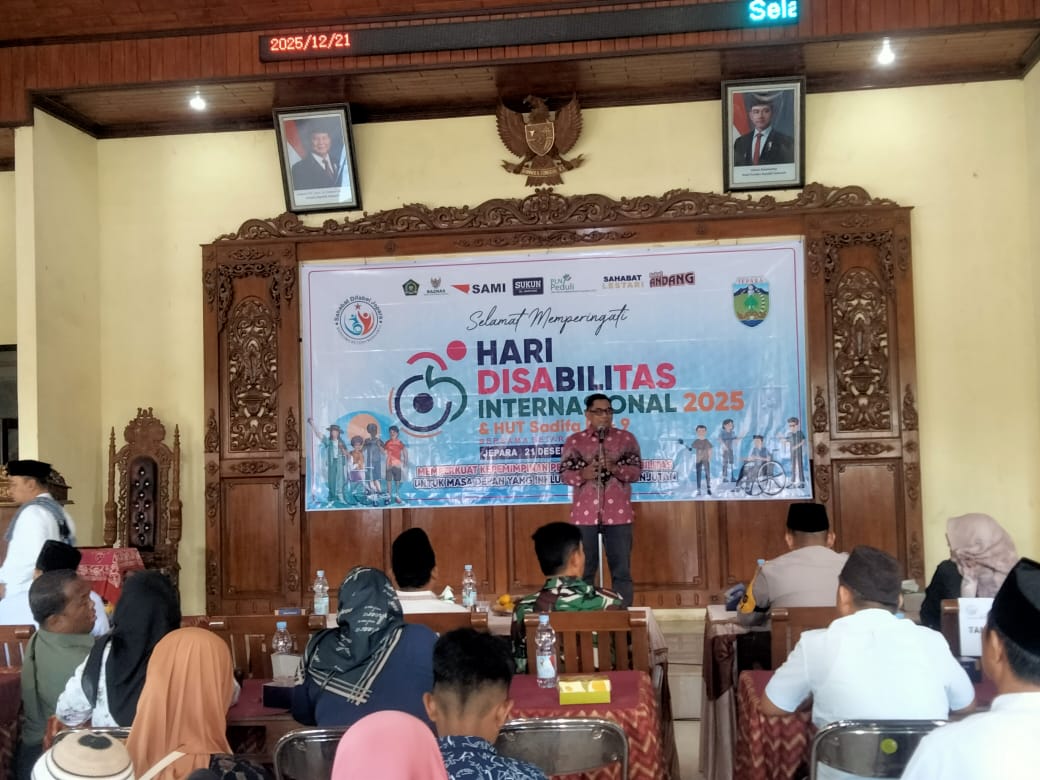 JEPARA , Transnewss.com – Hari Disabilitas Internasional 2025 dan HUT Sadifa ke-9 digelar di Kantor Balai Desa Ngabul, Kecamatan Tahunan, Kabupaten Jepara, Minggu (21/12/2025) pukul 08.00. Acara ini merupakan wujud kepedulian dengan dukungan dari SAHABAT DIFABEL JEPARA, SOBAT ANDANG, SAHABAT LESTARI, PLN PEDULI, PT SAMI, BAZNAS, SUKUN MC WARTONO, Departemen Agama, dan Pemkab Jepara.