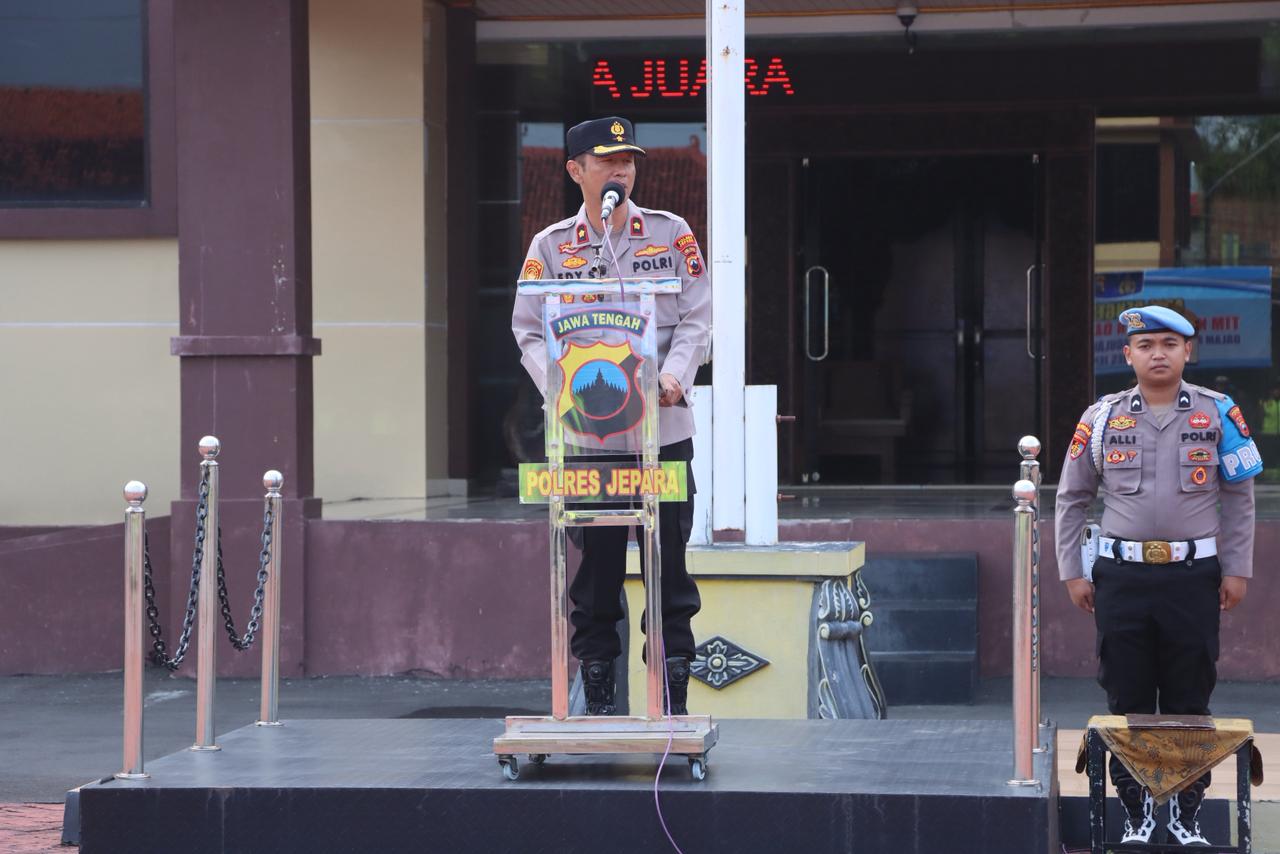 Apel ini dipimpin langsung oleh Wakapolres Jepara, Kompol Edy Sutrisno, dengan diikuti oleh jajaran Pejabat Utama (PJU), Kapolsek jajaran, serta seluruh personel Polres Jepara.