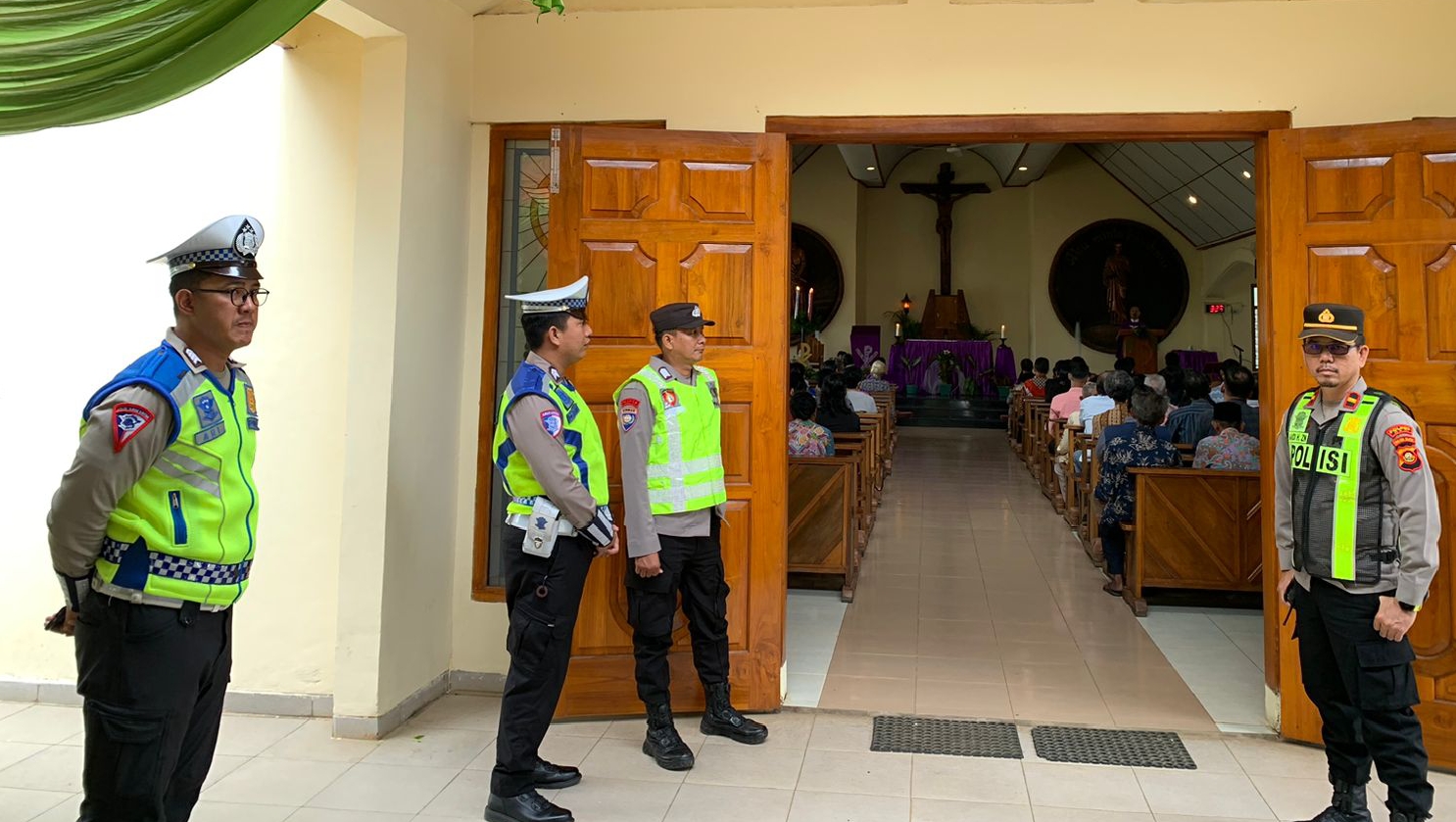 Pengamanan dilakukan sejak awal dengan penempatan personel di pintu masuk untuk memantau situasi, lingkungan sekitar, dan arus keluar masuk jemaat. Personel Polri tampak siaga dan ramah, menyapa jemaat serta memastikan ibadah berjalan lancar.