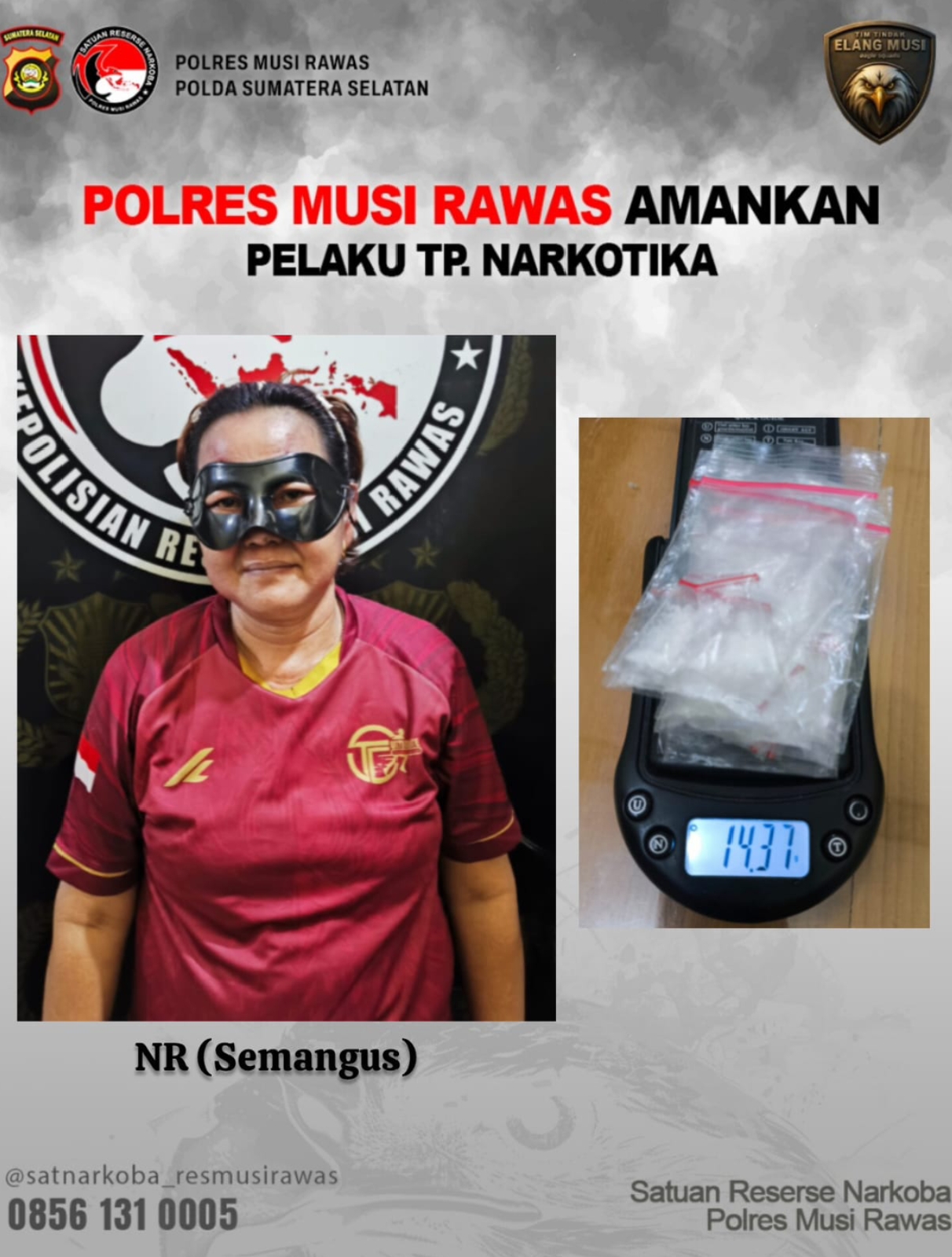 MUSI RAWAS, transnewss.com  – Tim Elang Musi Satuan Reserse Narkoba (Satresnarkoba) Polres Musi Rawas berhasil mengamankan seorang ibu rumah tangga (IRT) berinisial NR (49) di Dusun Panglero, Desa Semangus Lama, Kecamatan Muara Lakitan, Musi Rawas. NR ditangkap pada Selasa (24/11/2025) sekitar pukul 17.00 WIB atas dugaan kasus penyalahgunaan narkotika jenis sabu dengan barang bukti seberat 14,37 gram (bruto).