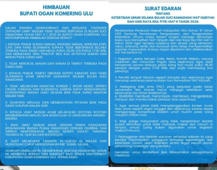 Dalam arahan resmi yang disampaikan, Pemkab OKU menekankan pada pembatasan jam operasional bagi usaha yang menjual makanan dan minuman pada periode siang hari. Warung makan, restoran, dan kafe diimbau untuk tidak melayani pelanggan secara terbuka. Bagi yang tetap beroperasi, pemilik usaha diwajibkan memasang tirai atau penghalang penutup sebagai bentuk penghormatan kepada umat yang menjalankan ibadah puasa.