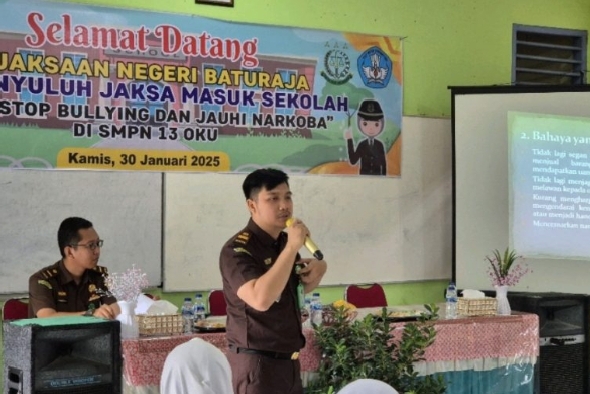 Baturaja,transnewss.com – Tim Intelijen Kejaksaan Negeri (Kejari) Ogan Komering Ulu (OKU) kembali menggelar kegiatan Jaksa Masuk Sekolah (JMS) di SMPN 13 OKU pada tanggal 30 Januari 2024. Kegiatan ini diikuti oleh siswa-siswi sekolah tersebut dengan tema “Cyber Bullying dan Penyalahgunaan Narkoba”.