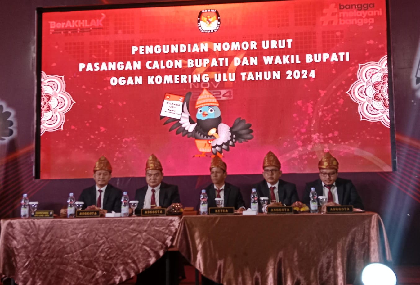 Baturaja,transnewss.com –Komisi Pemilihan Umum( KPU) Kabupaten Ogan Komring Ulu menggelar pengundian nomor pasangan Calon Bupati dan Wakil Bupati di Hotel Bukit Indah LestariI(H-Bil) Senin siang (23/9/2024).