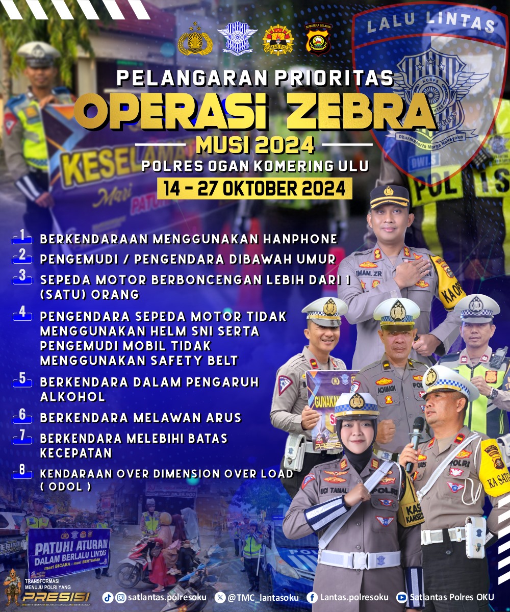 Baturaja,transnewss.com – Mulai hari ini Senin, (14/10/2024) hingga tanggal 27 Oktober 2024 mendatang, Kepolisian republik indonesia secara serentak menggelar OPS Zebra. Operasi yang rutin di gelar setiap tahun ini akan menyasar 8 kesalahan mendasar yang kerap di langgar oleh pengendara baik roda 2 (R2) maupun roda 4 (R4).