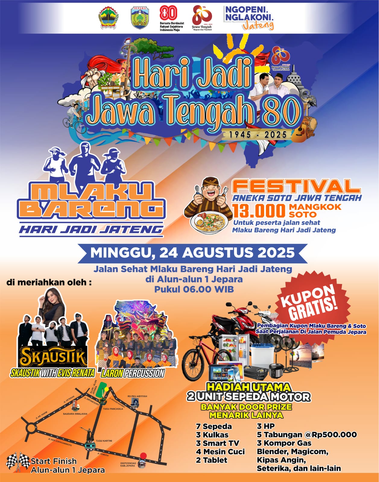 JEPARA, transnewss.com – Provinsi Jawa Tengah merayakan hari jadinya yang ke-80 tahun (1945-2025) dengan serangkaian acara meriah. Bekerja sama dengan Pemerintah Kabupaten Jepara, perayaan dipusatkan di Alun-Alun Jepara. Acara ini disambut antusias oleh masyarakat yang memadati lokasi.