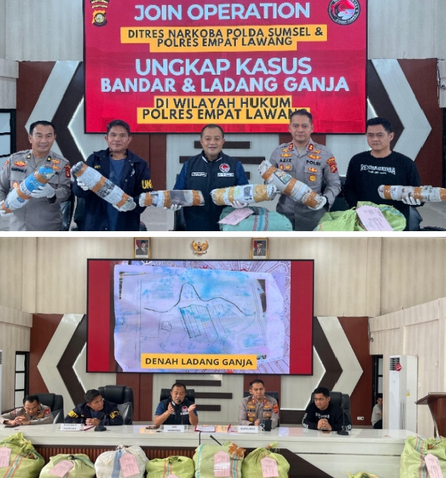 EMPAT LAWANG, transnewss.com  – Sinergi Direktorat Reserse Narkoba Polda Sumatera Selatan dan Polres Empat Lawang berhasil memutus rantai produksi ganja skala besar. Dalam operasi gabungan yang digelar pada Jumat (24/4/2026), petugas membongkar ladang ganja seluas 20 hektar di Desa Batu Jungul, Kecamatan Muara Pinang, serta menyita 220 kilogram ganja kering siap edar.