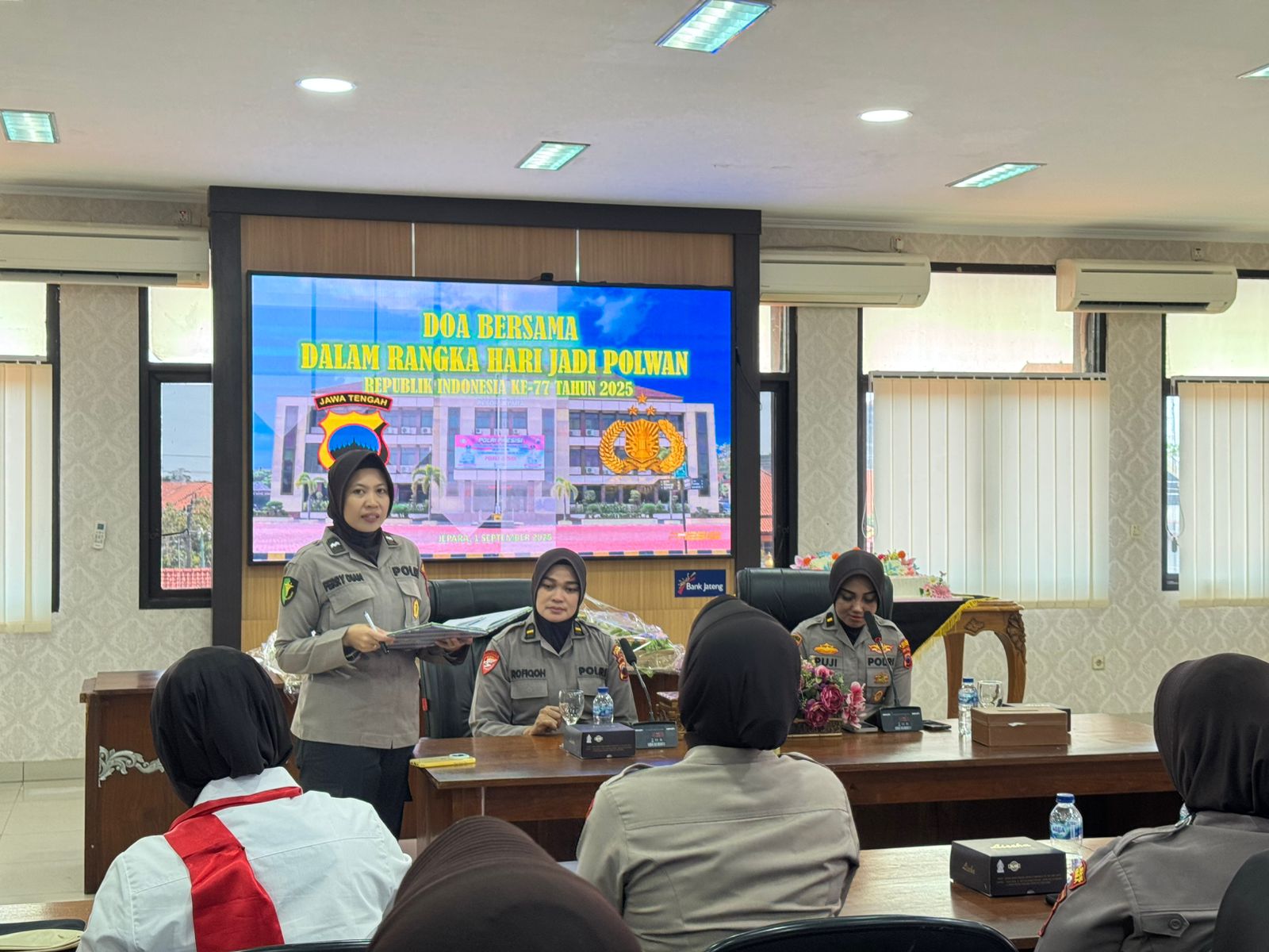 Jepara, transnewss.com – Polres Jepara menggelar doa bersama yang khidmat dan penuh kebersamaan untuk memperingati Hari Jadi Polisi Wanita (Polwan) Republik Indonesia ke-77. Acara ini diadakan di aula Mapolres Jepara pada Senin (1/9/2025).