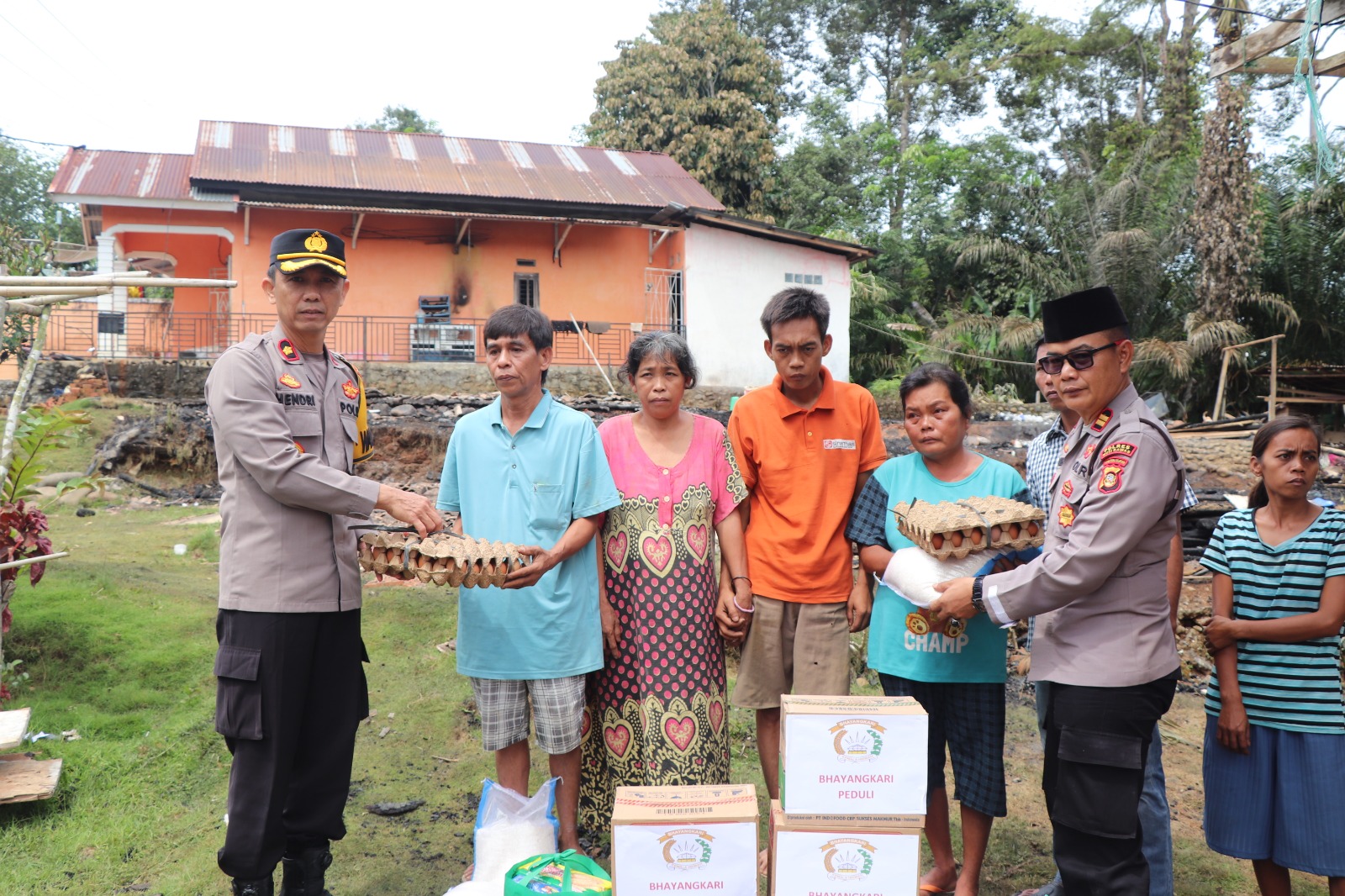 Wakapolres Musi Rawas, Kompol Hendri, S.H., didampingi Kasi Humas Ipda Aji Lamsari, Kapolsek Jayaloka Iptu M. Soleh, S.H., dan Kapolsek Muara Beliti Iptu Miming Iskandar, menyerahkan bantuan kepada: