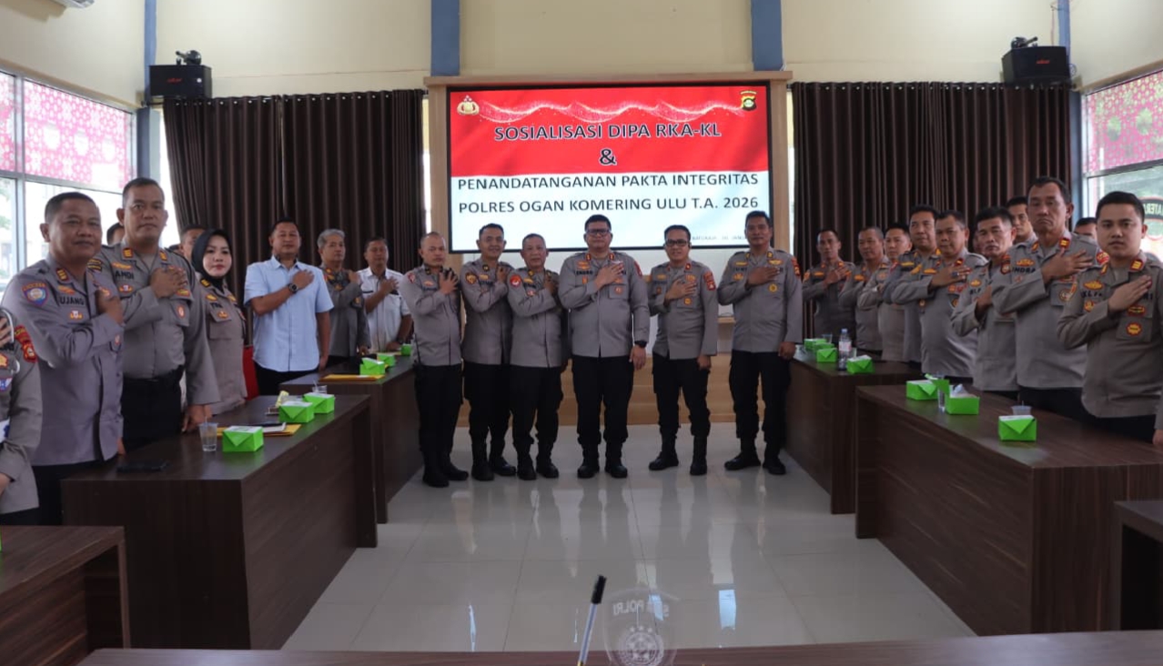 Baturaja, transnewss.com – Polres Ogan Komering Ulu (Oku) menggelar kegiatan Sosialisasi Dokumen Induk Pelaksanaan Anggaran dan Rencana Kebutuhan Lokal (DIPA-RKL) Tahun Anggaran 2026 sekaligus Penandatanganan Pakta Integritas, Selasa (06/01/2026) di Gedug Kaca Polres Oku.