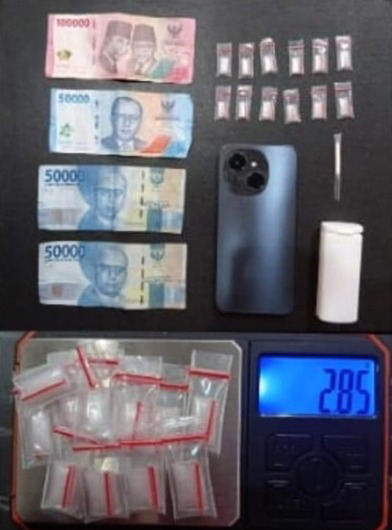 Dari hasil penggeledahan badan, polisi menemukan barang bukti yang disembunyikan secara rapi di pinggang kiri di balik celana pendek tersangka. Adapun barang bukti yang disita meliputi:
