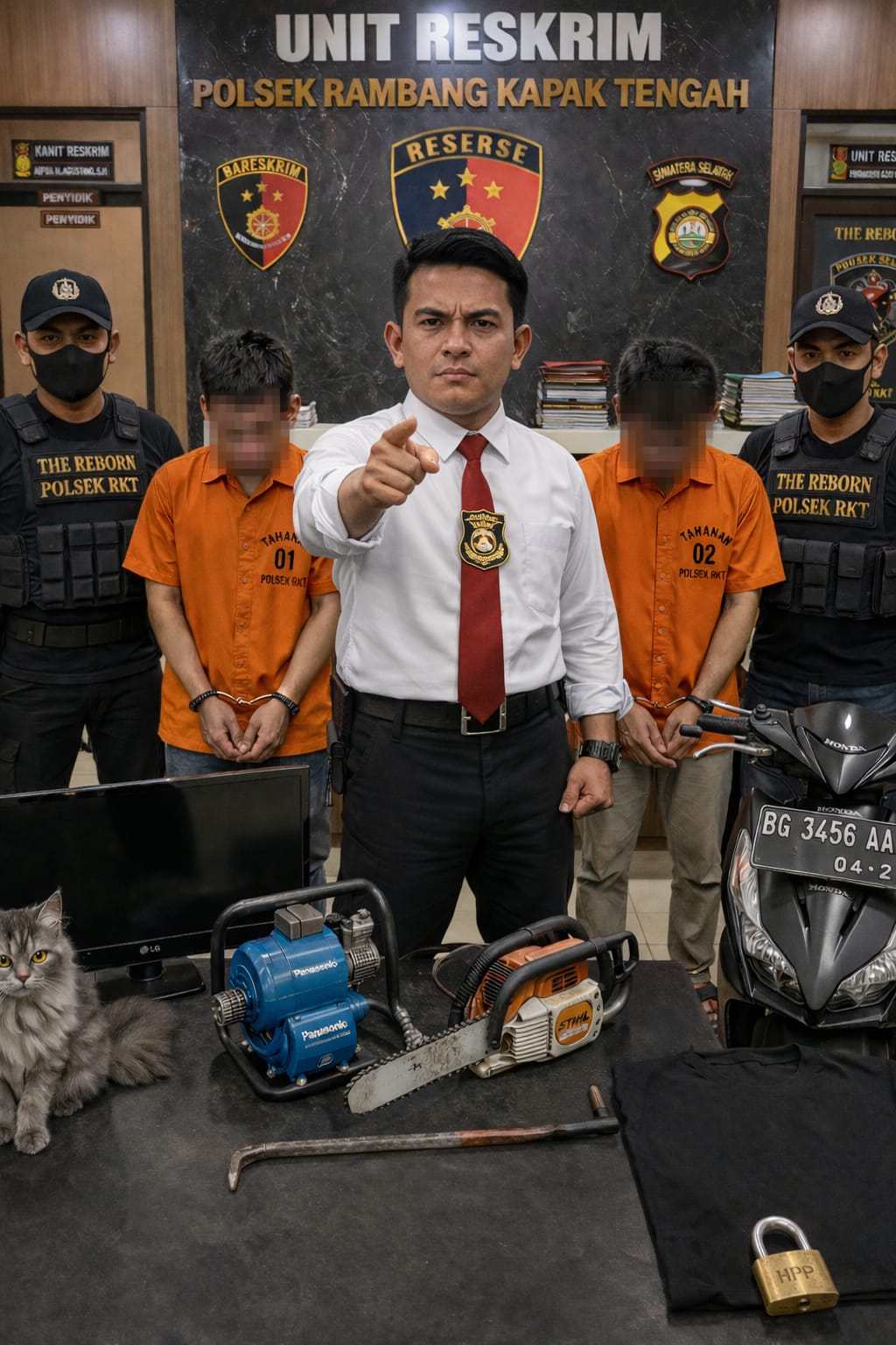 PRABUMULIH, transnewss.com — Unit Reskrim Polsek Rambang Kapak Tengah (RKT) berhasil mengungkap kasus pencurian dengan pemberatan (Curat) yang menyasar sebuah pondok di perkebunan durian, Desa Karangan. Dua orang tersangka berinisial D.E. (37) dan Y.K. (41) ditangkap tim opsnal dalam operasi yang digelar pada Senin dini hari, 6 April 2026.