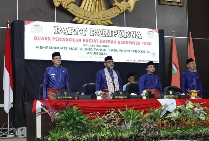 Tebo,transnewss.com – Penjabat (Pjs) Gubernur Jambi Dr. H. Sudirman, SH, MH mengemukakan bahwa peringatan ulang tahun merupakan momentum untuk evaluasi, hal-hal yang sudah baik dipertahankan bahkan ditingkatkan, sedangkan yang kurang, diperbaiki. Hal tersebut dikemukakannya saat menghadiri Rapat Paripurna DPRD Kabupaten Tebo Dalam Rangka Hari Ulang Tahun Ke-25 Kabupaten Tebo, bertempat di Aula Gedung DPRD Kabupaten Tebo, Sabtu (12/10/2024).