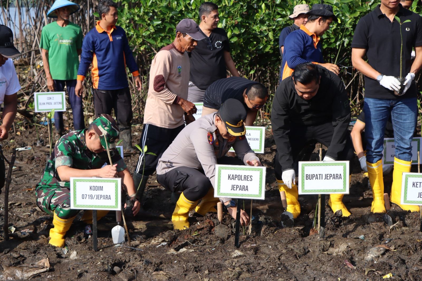 Penanaman ini dihadiri langsung oleh Bupati Jepara Witiarso Utomo, Kapolres Jepara AKBP Erick Budi Santoso, Dandim 0719/Jepara Letkol Arm Khoirul Cahyadi, serta jajaran pejabat dan warga setempat.