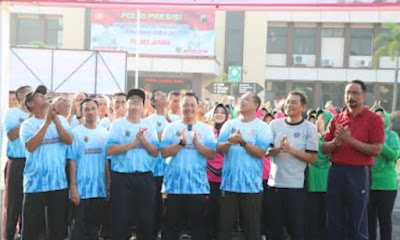 Olahraga bersama dipimpin langsung Kapolres Jepara AKBP Wahyu Nugroho Setyawan bersama Kasdim 0719/Jepara Mayor Arm Sarifudin Widianto dengan diikuti oleh jajaran Forkopimda Jepara, personil dari Polres Jepara, Kodim 0719/Jepara, Ibu-Ibu Bhayangkari hingga Persit Candra Kirana serta tamu undangan lainnya.