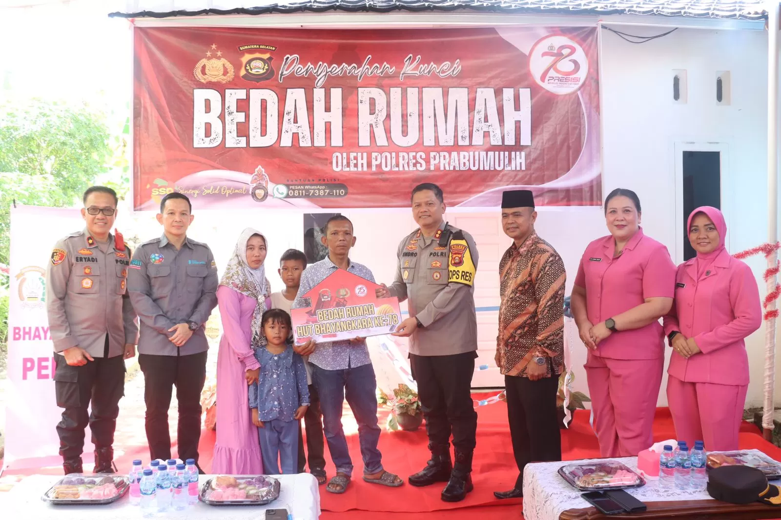 Penyerahan kunci rumah tersebut dilakukan langsung oleh Kapolres Prabumulih, AKBP Endro Aribowo, S.I.K., yang memimpin proses serah terima dengan penuh rasa haru. Dalam sambutannya, Kapolres menegaskan bahwa program bedah rumah ini merupakan bagian dari rangkaian kegiatan sosial yang dilakukan Polres Prabumulih dalam memperingati Hari Bhayangkara, yang jatuh pada 1 Juli setiap tahunnya.
