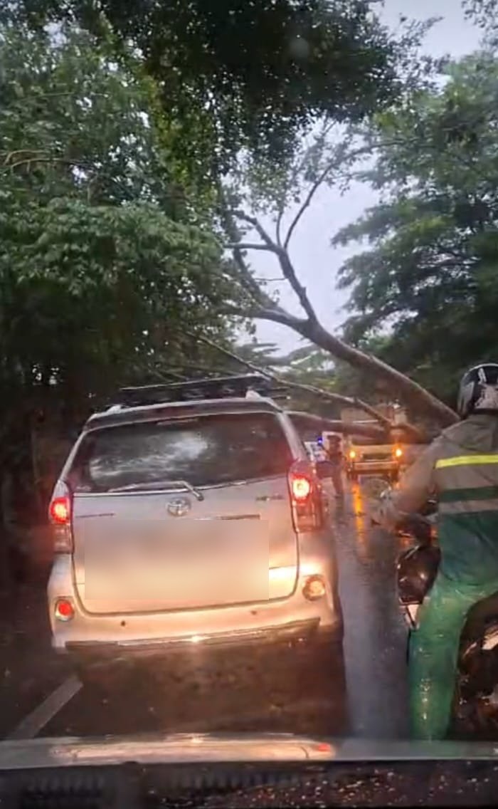 Pohon tumbang yang menutup badan jalan, belum diketahui jenisnya. Namun imbasnya, antrean kendaraan dari dua arah tak bisa dielakkan lagi.